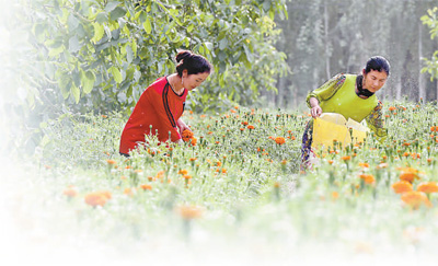 于田县先拜巴扎镇良种场村村民在采摘万寿菊。