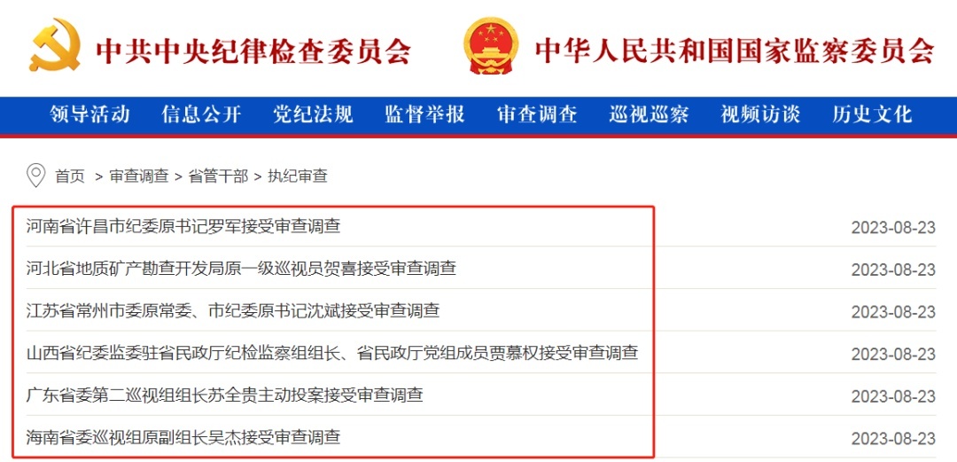 8月23日上午,中央纪委国家监委网站连续发布6名正在或曾在纪检监察系统任职的厅局级干部被查的消息,其中一人为主动投案。