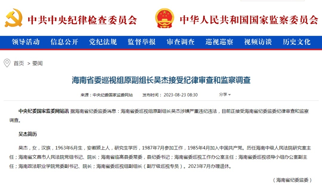 中央纪委国家监委援引海南省纪委监委消息:海南省委巡视组原副组长吴杰涉嫌严重违纪违法,目前正接受海南省纪委监委纪律审查和监察调查。
