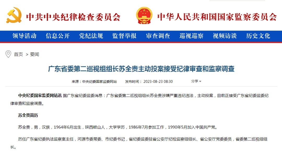 中央纪委国家监委援引广东省纪委监委消息:广东省委第二巡视组组长苏全贵涉嫌严重违纪违法,主动投案,目前正接受广东省纪委监委纪律审查和监察调查。