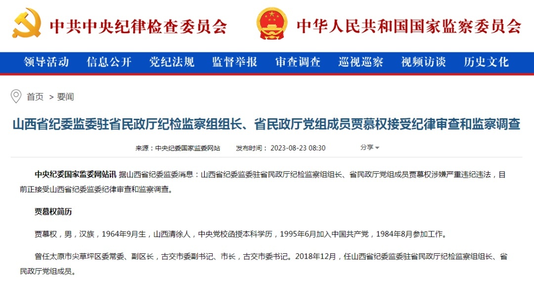 中央纪委国家监委援引山西省纪委监委消息:山西省纪委监委驻省民政厅纪检监察组组长、省民政厅党组成员贾慕权涉嫌严重违纪违法,目前正接受山西省纪委监委纪律审查和监察调查。