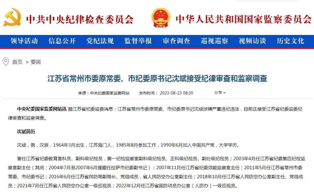中央纪委国家监委援引江苏省纪委监委消息:江苏省常州市委原常委、市纪委原书记沈斌涉嫌严重违纪违法,目前正接受江苏省纪委监委纪律审查和监察调查。