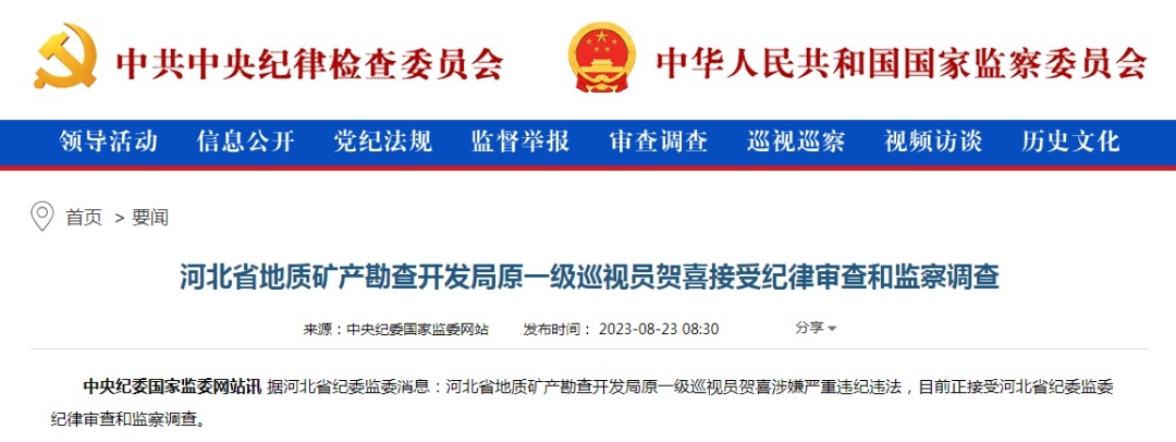 中央纪委国家监委援引河北省纪委监委消息:河北省地质矿产勘查开发局原一级巡视员贺喜涉嫌严重违纪违法,目前正接受河北省纪委监委纪律审查和监察调查。