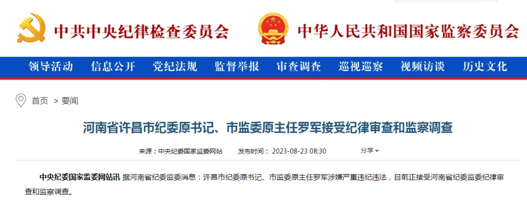 中央纪委国家监委援引河南省纪委监委消息:许昌市纪委原书记、市监委原主任罗军涉嫌严重违纪违法,目前正接受河南省纪委监委纪律审查和监察调查。