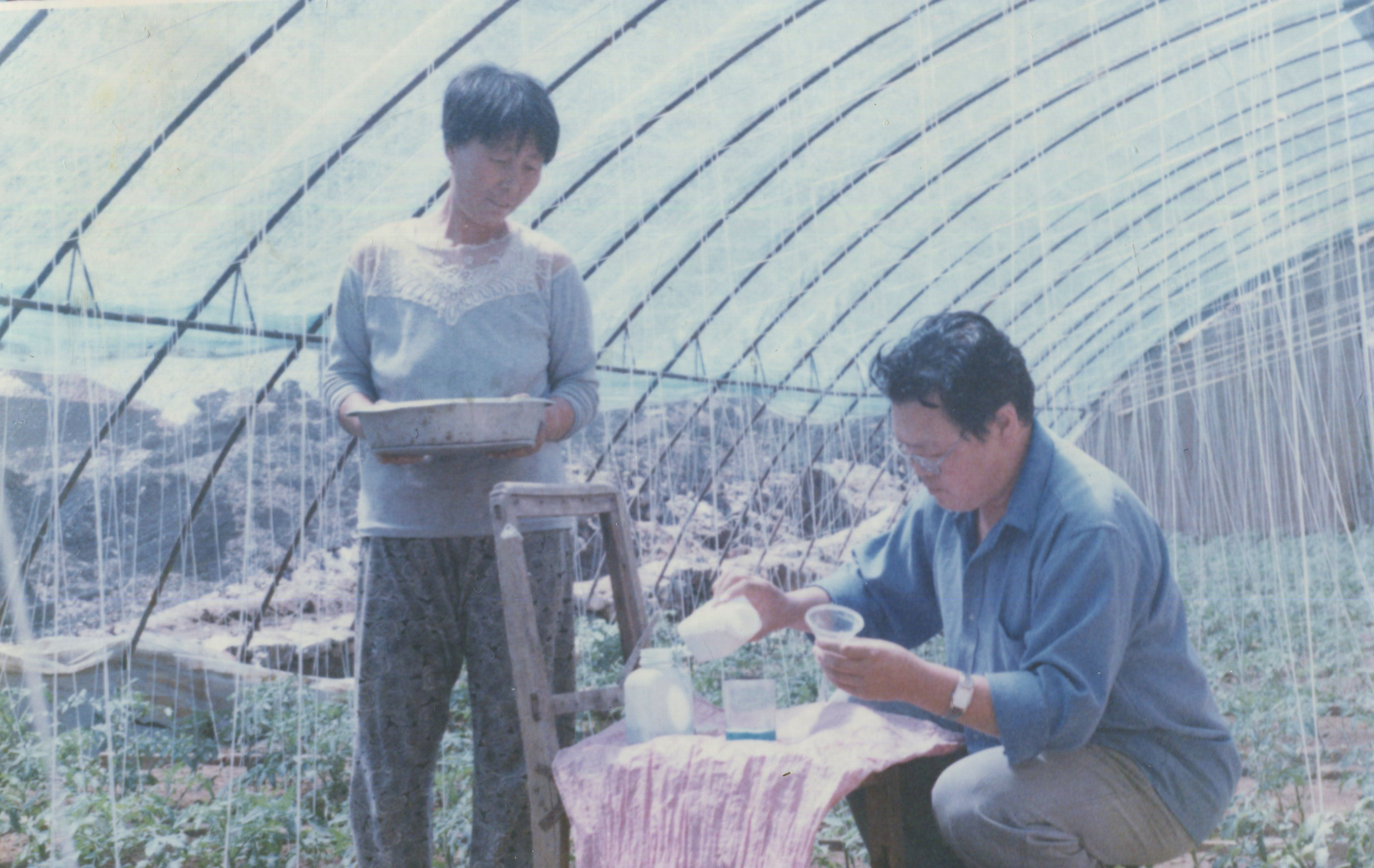 图为1996年,关慧明(右)在乌兰察布市集宁区罗家村大棚内进行施肥试验。受访者供图