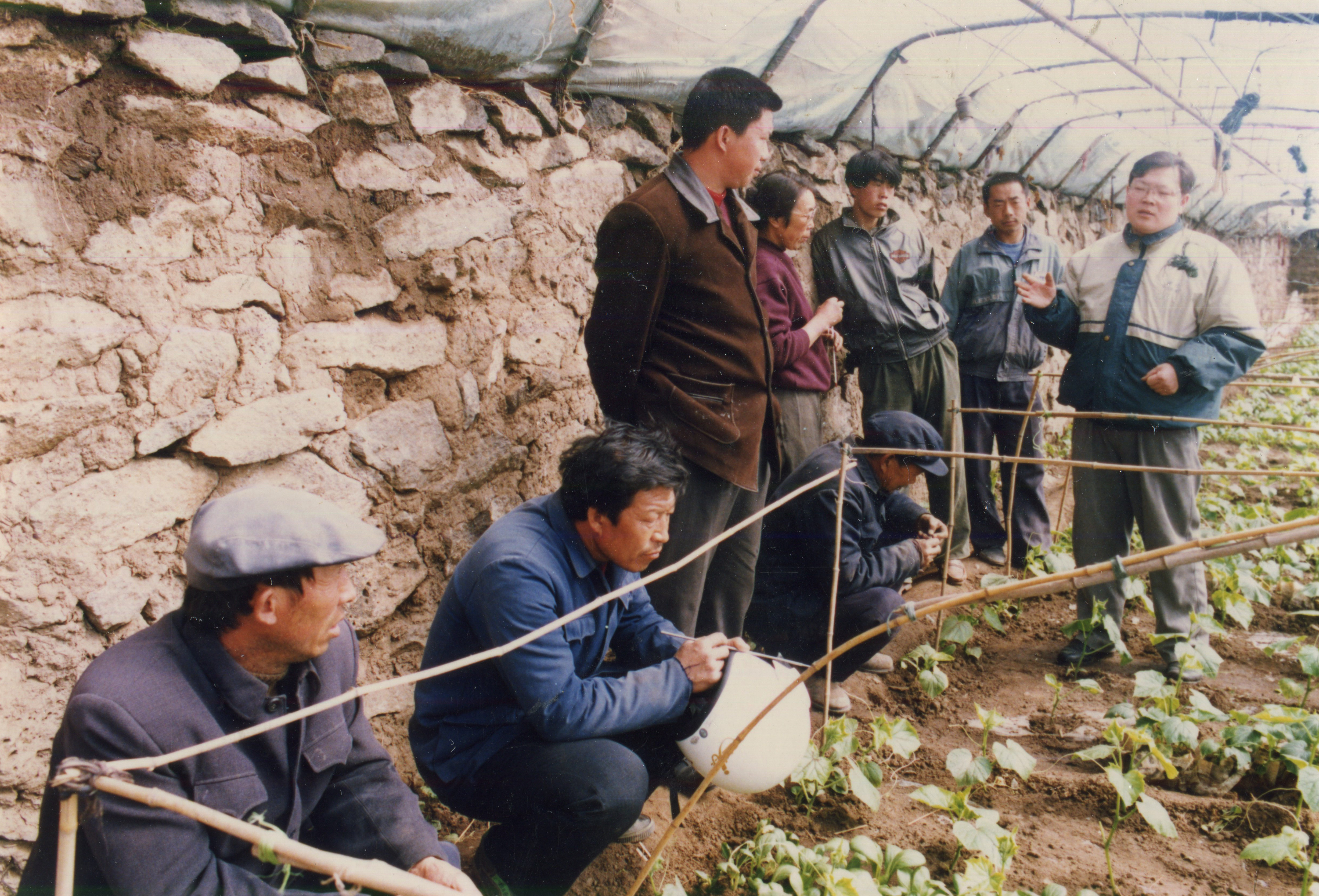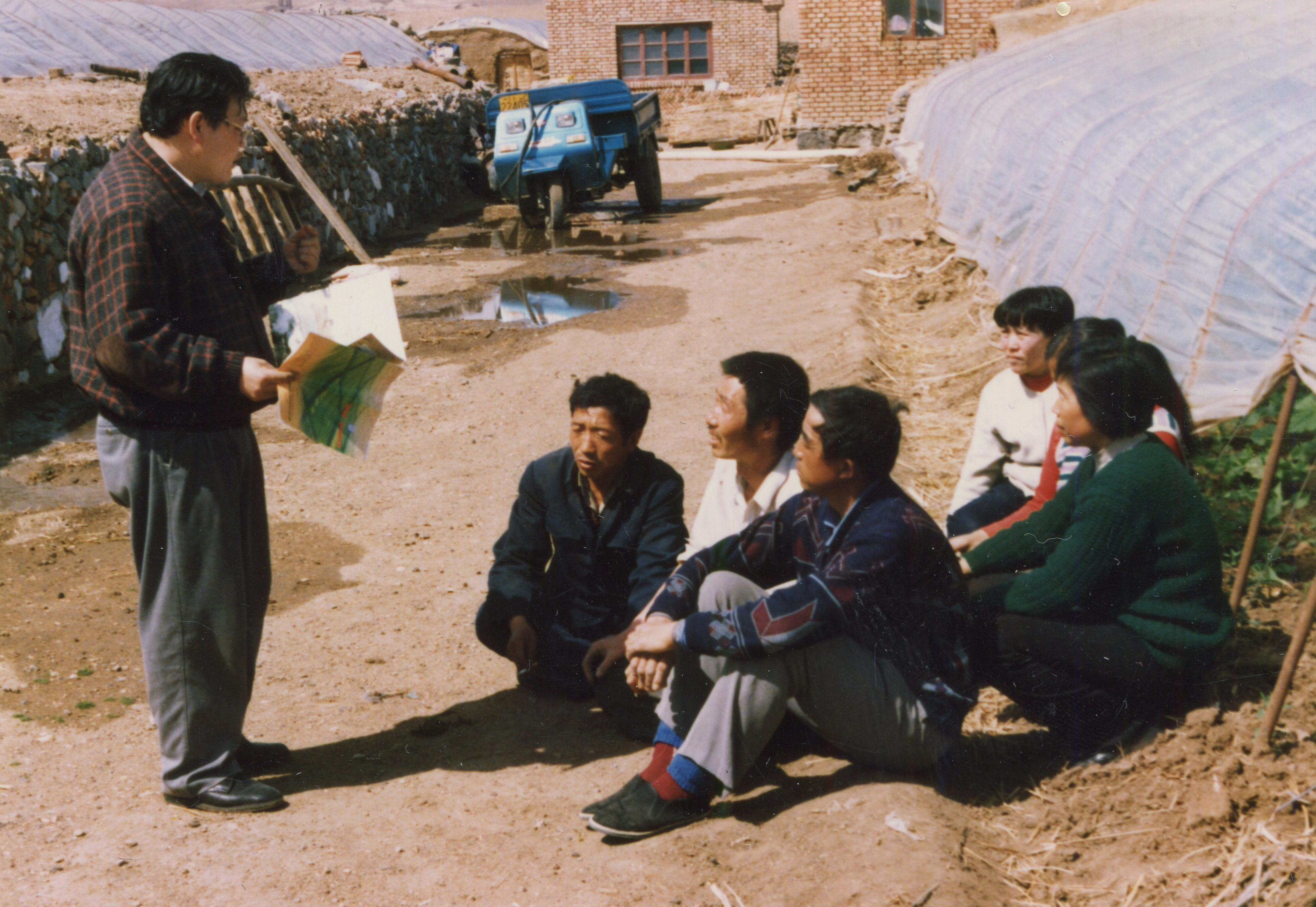 图为2000年,关慧明(右一)在乌兰察布市集宁区霸王河村指导菜农。受访者供图