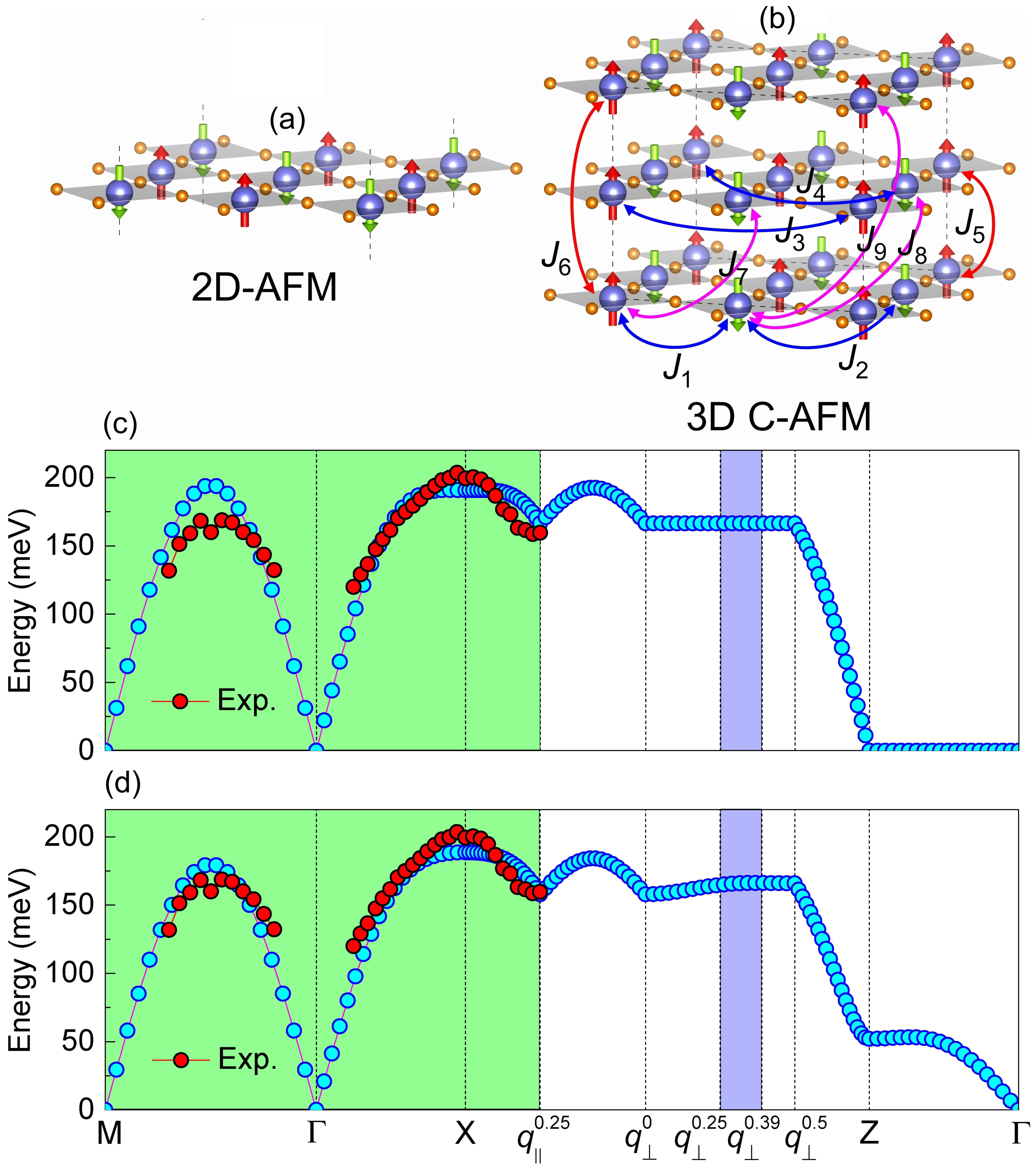 图2. (a) 2D反铁磁序示意图, (b) 3D C-type反铁磁序示意图, (c) 2D及 (d) 3D磁序交换系数计算的磁散射普与实验对比