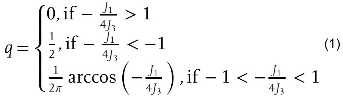 为了证实这个设想,建立了包含J1与J3的海森堡模型并理论计算了波矢q随掺杂浓度的变化。该模型的结果表明自旋磁序是由J3的属性(反铁磁或铁磁耦合)和J1与J3比值共同决定的(公式1和图3(e)),与基于GBT和MFT算法的结果及上面的理论预测高度一致(图3(e))。