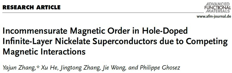 相关研究成果以“Incommensurate Magnetic Order in Hole-Doped Infinite-Layer Nickelate Superconductors due to Competing Magnetic Interactions” 为题发表在国际期刊《Advanced Functional Materials》(2023, 33 (30), 2304187)。兰州大学为独立通讯单位,张亚君副教授为通讯作者,他与比利时列日大学何旭研究员为共同第一作者。浙江大学王杰教授,列日大学Philippe Ghosez教授和之江实验室张菁桐博士后为论文的合作者。该工作得到了国家自然科学基金及兰州大学科研启动经费等的支持,数值计算工作得到兰州大学超算中心的大力支持。