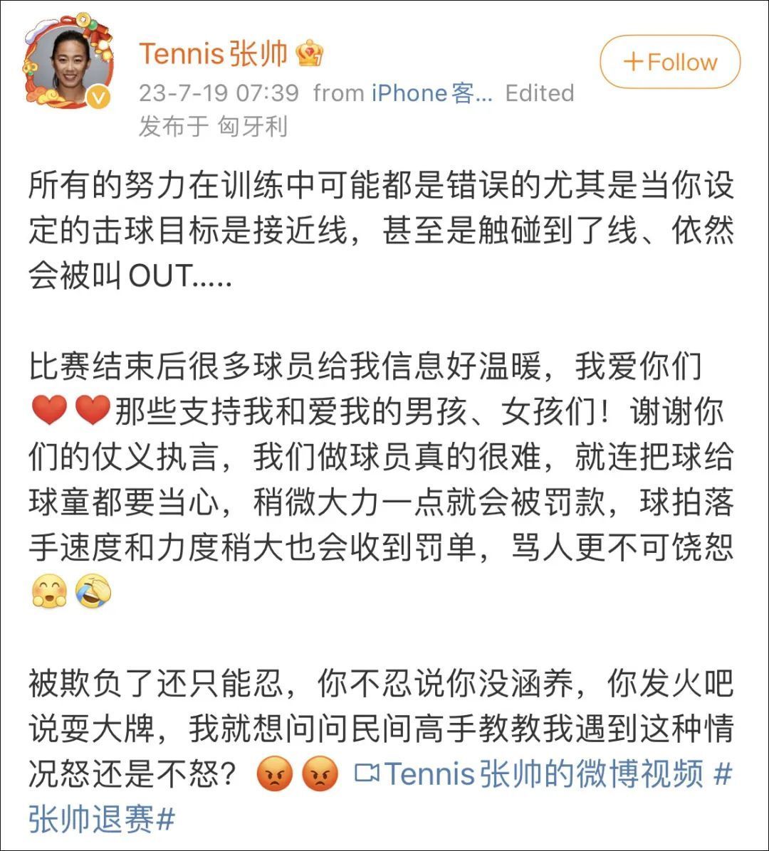 19日,张帅本人在微博、Instagram上发文称:“所有的努力在训练中可能都是错误的,尤其是当你设定的击球目标是接近线,甚至是触碰到了线、依然会被叫OUT……比赛结束后很多球员给我信息好温暖,我爱你们。那些支持我和爱我的男孩、女孩们!谢谢你们的仗义执言,我们做球员真的很难……被欺负了还只能忍,你不忍说你没涵养,你发火吧说耍大牌,我就想问问民间高手教教我遇到这种情况怒还是不怒?”