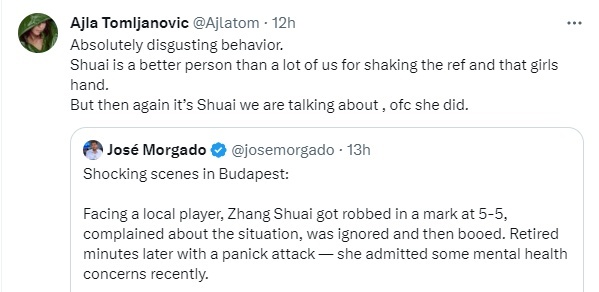 “绝对恶心的行为,”澳大利亚女子网球选手艾拉·汤姆贾诺维奇在推特发文称,“张帅还与裁判和那个女孩握了手,她比我们很多人都好。”