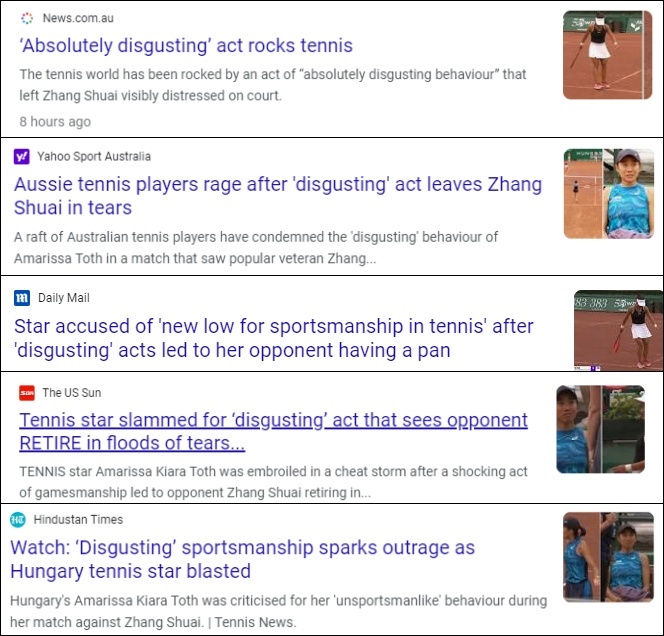 澳大利亚第九网络频道旗下体育网站wwos直接发文《在对手的‘恶心’行为后,‘最好的女孩’张帅含泪退赛,世界网坛爆发了》。澳大利亚第七新闻网和英国《每日邮报》称,托特的表现被球迷成为“体育精神的新低点”。