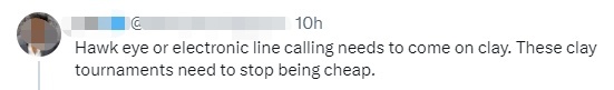 “得引进鹰眼或者电子裁判,这些红土比赛不能再造假了。”