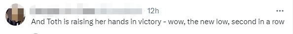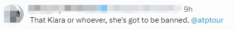 双打世界排名第九的澳大利亚女选手艾伦·佩雷斯直指托特已经失去了同行的尊重:“我真的被这个女孩的行为的不尊重程度震惊了……如果我明天见到这个女孩,我会告诉她,这有多恶心。”