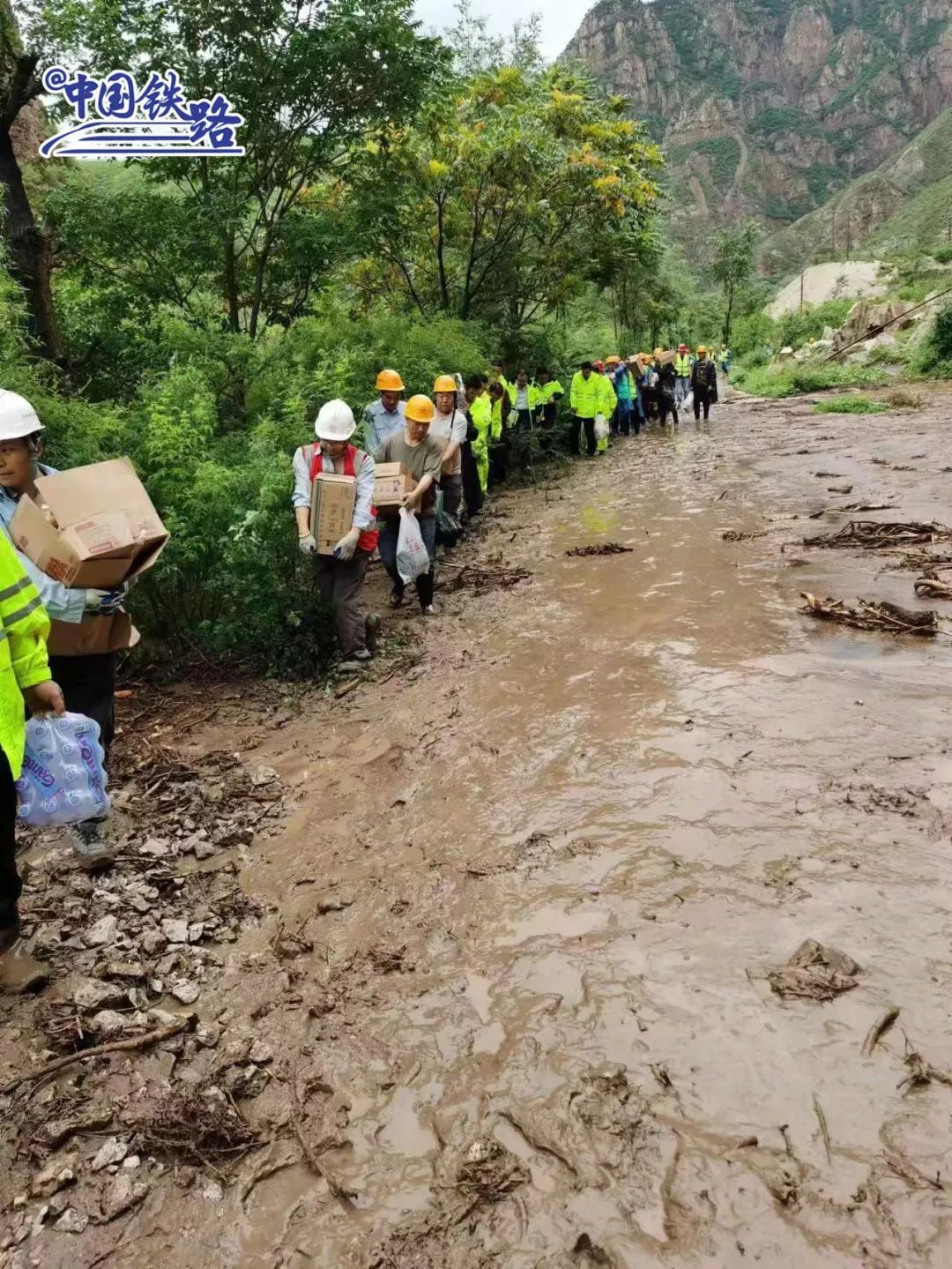 此地线路完全中断,列车无法前行。突击队人员正以肩扛手提、徒步搬运的方式分批将方便面、矿泉水、火腿肠等生活物资往沿城河站运送。刚刚,第一批救援物资已送达受困于K1178次列车的旅客手中。