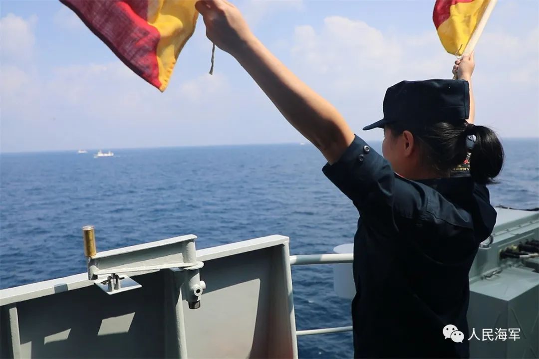 ▲乌鲁木齐舰用海军特有的旗语向船员致意。王远方 摄