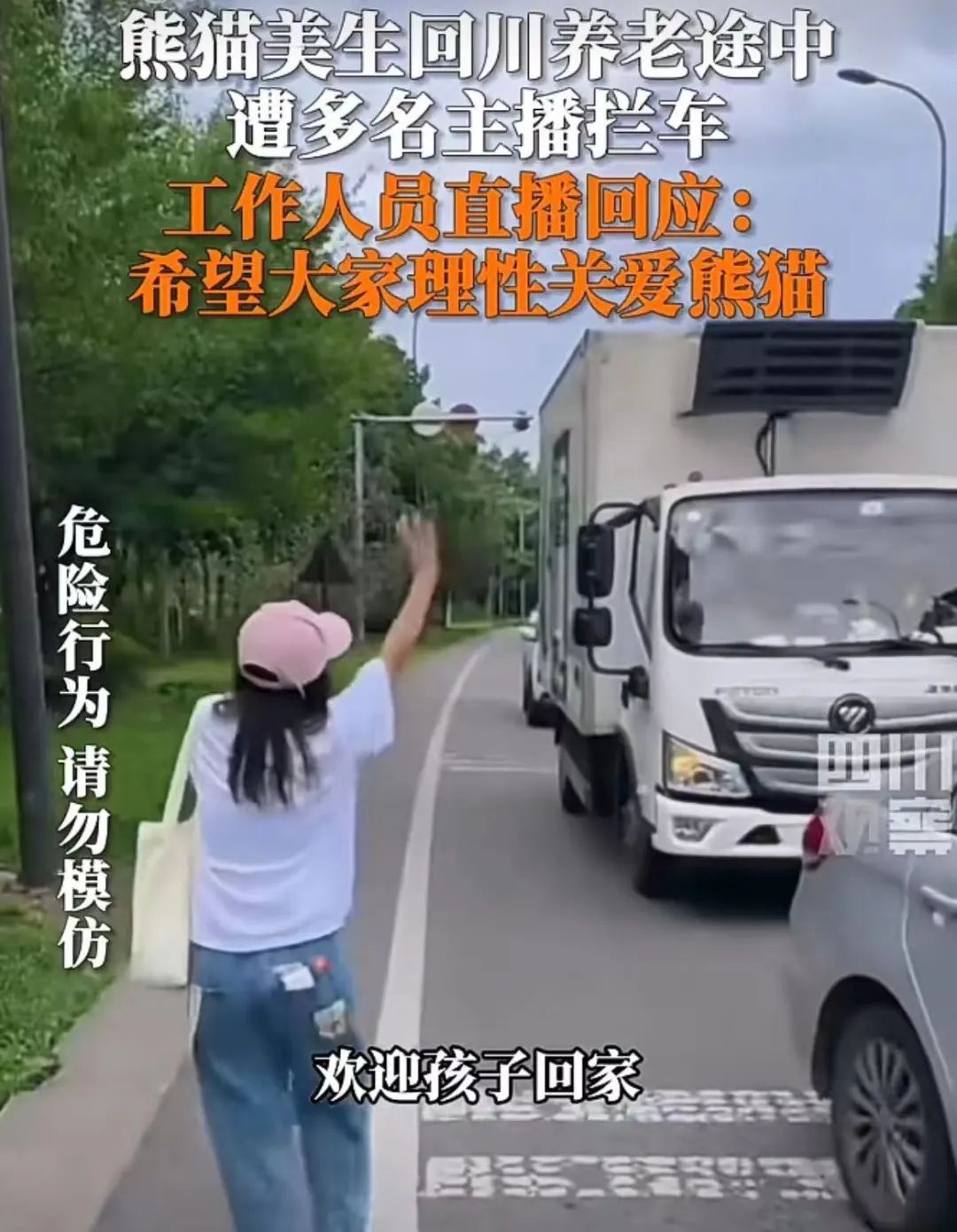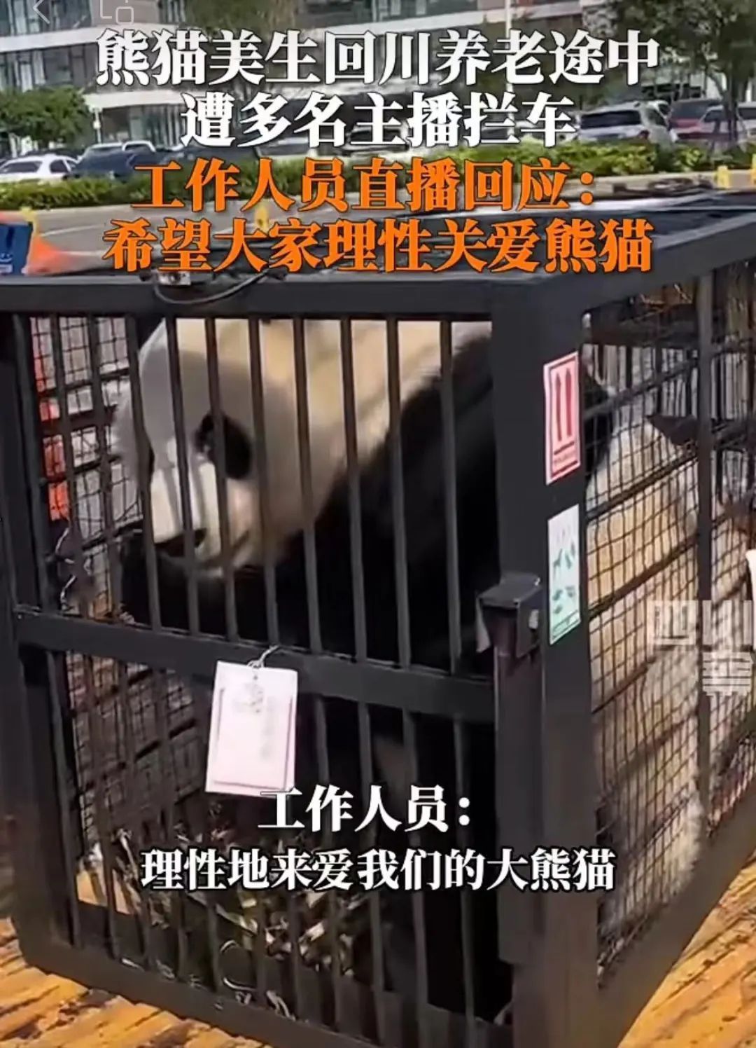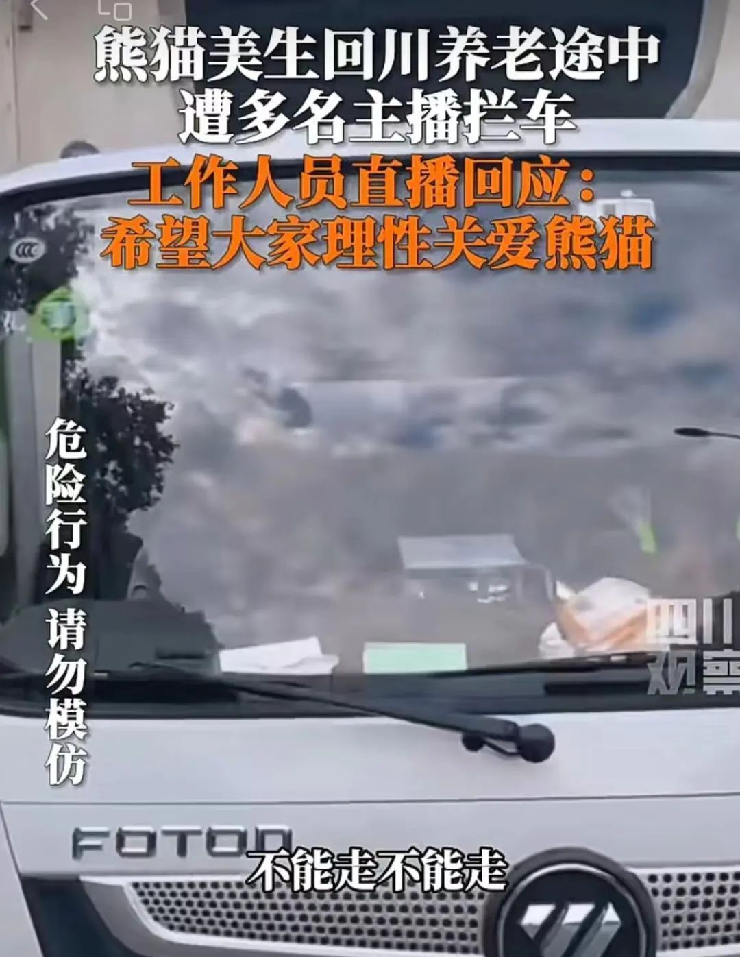 据@四川观察 消息,近日,大熊猫“美生”乘飞机平安抵达四川,前往卧龙大熊猫自然保护区。途中,“美生”搭乘的车辆被主播拦截。