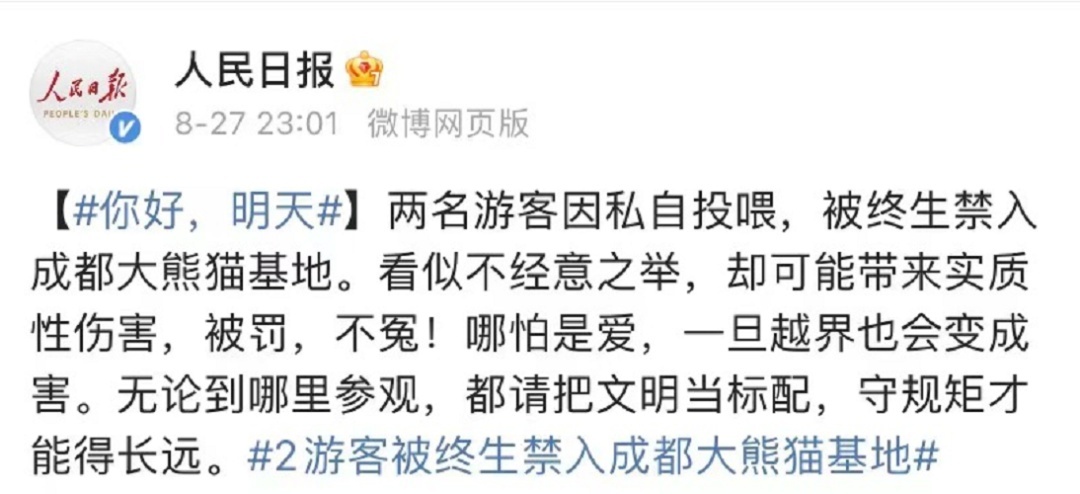 值得注意的是,8月27日,成都大熊猫繁育研究基地发布关于不文明行为情况的通报,内容如下: