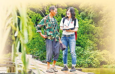 记者黄娴(右)在贵州黎平县采访红军桥的故事。
