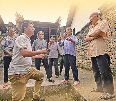 记者何勇(左一)在湖南桂东县寨前镇广场采访黄维忠老人。