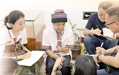记者林小溪(左一)在广东连州博物馆采访红军交通员的后人。
