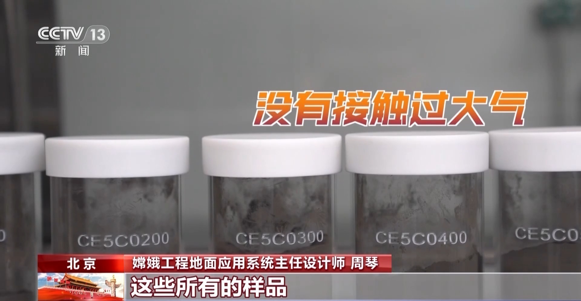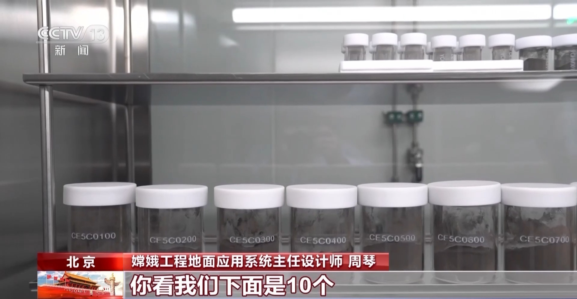 嫦娥工程地面应用系统主任设计师 周琴:它全都分好了,你看我们下面是10个,上面那个瓶子也是10个,每一罐都是10克的样品。