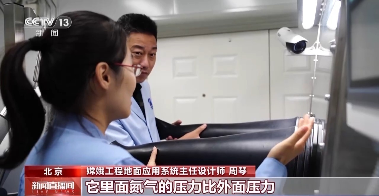 环境要模仿月表,月表就是无水低氧,这里面充的都是高纯氮气。你看这手套露出来,它里面氮气的压力比外面压力稍微高一点,实际上也是防止空气进去。主要是想让它在比较好的环境下能够存的时间长一些,这样后续科学家做科学实验的时候,不会因为地球环境对它造成样品的污染,导致去错误地解读数据。