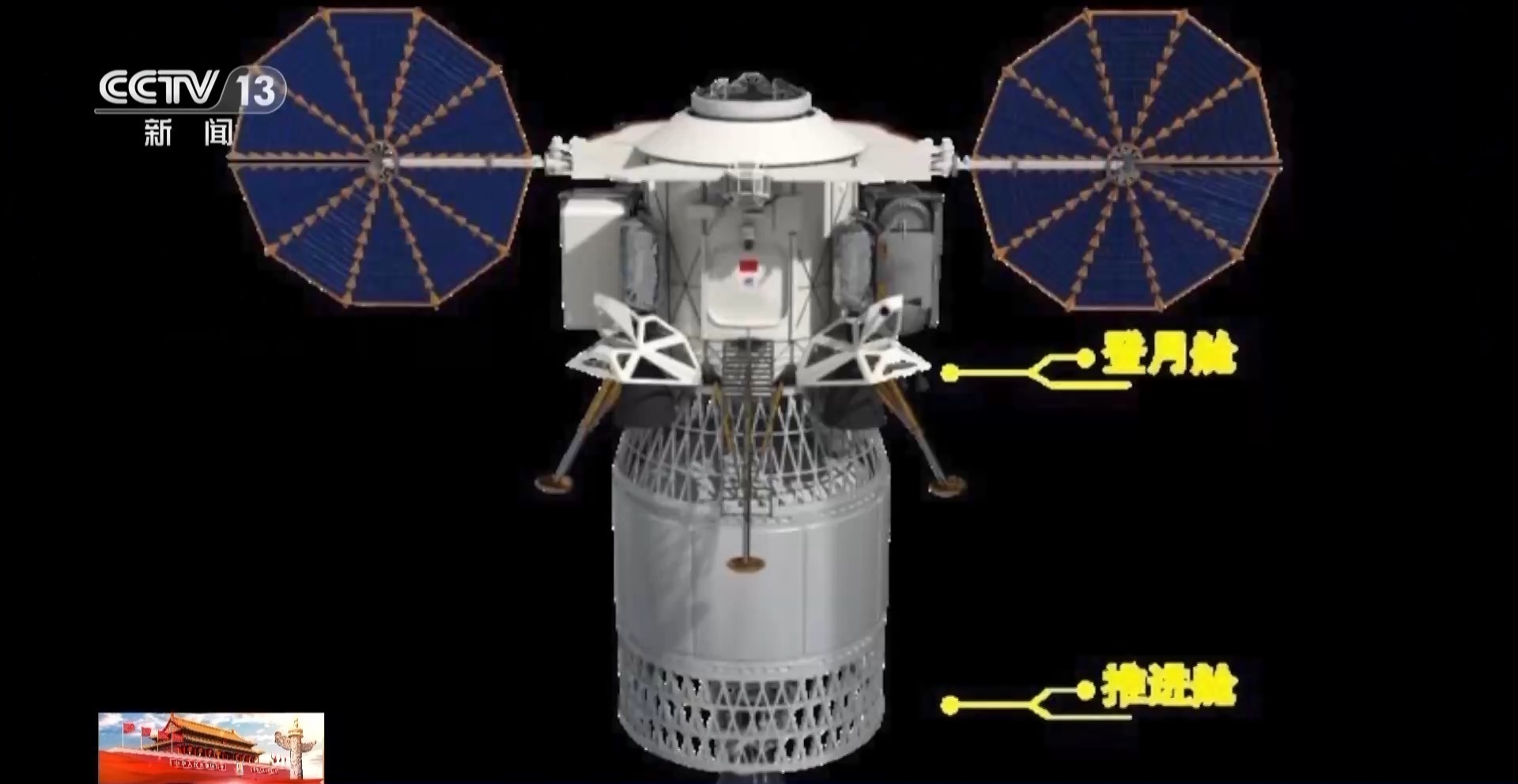 月面着陆器是我国全新研制的地外天体载人下降与上升飞行器,由登月舱和推进舱组成。主要用于环月轨道和月球表面间的航天员运输,可搭载2名航天员往返,并可携带月球车和科学载荷。
