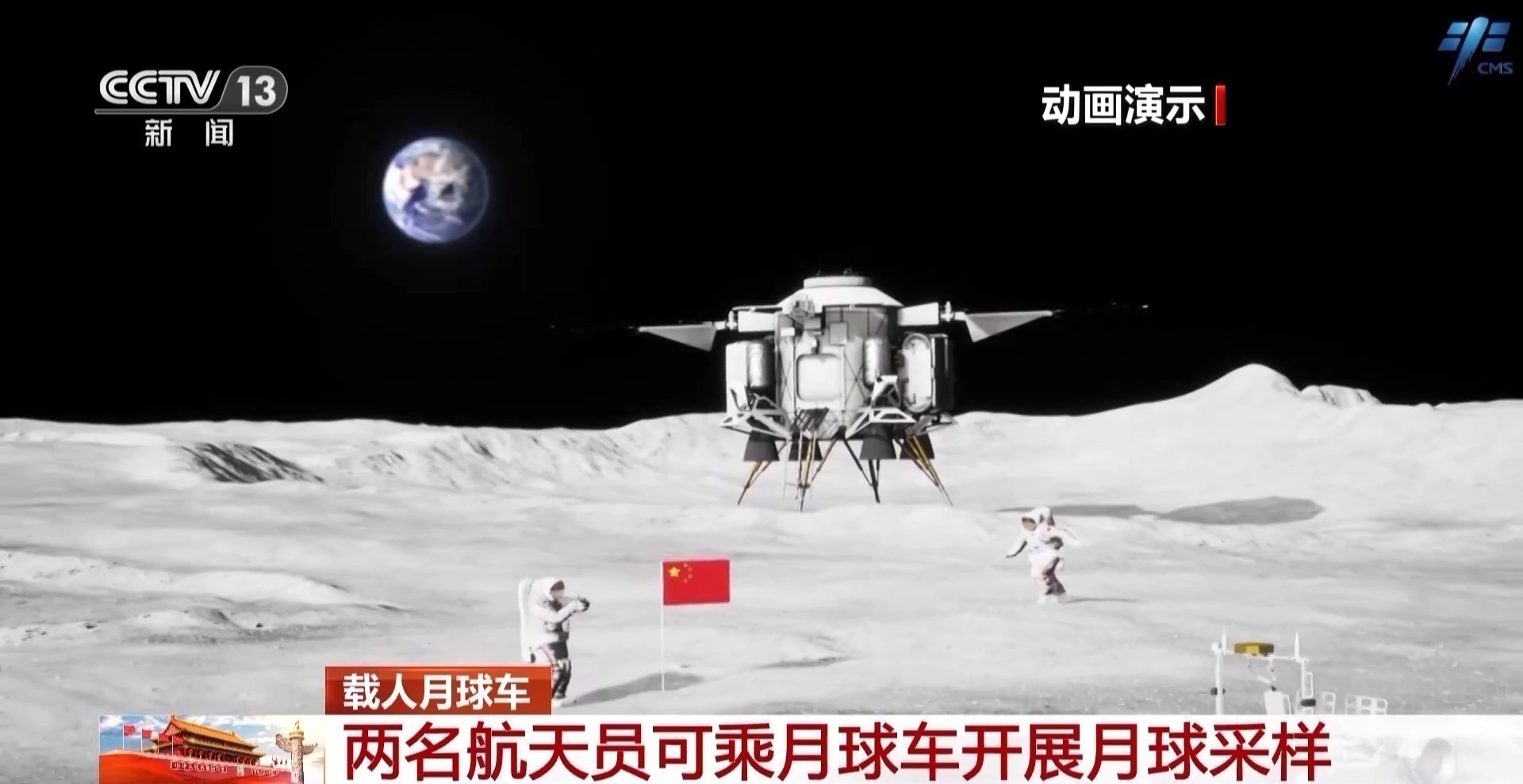 月面着陆器到达月面后,航天员将乘坐月球车,在月面开展工作。载人月球车重约200公斤,可搭乘两名航天员,航天员将乘着月球车在10公里的范围之内开展月球采样。