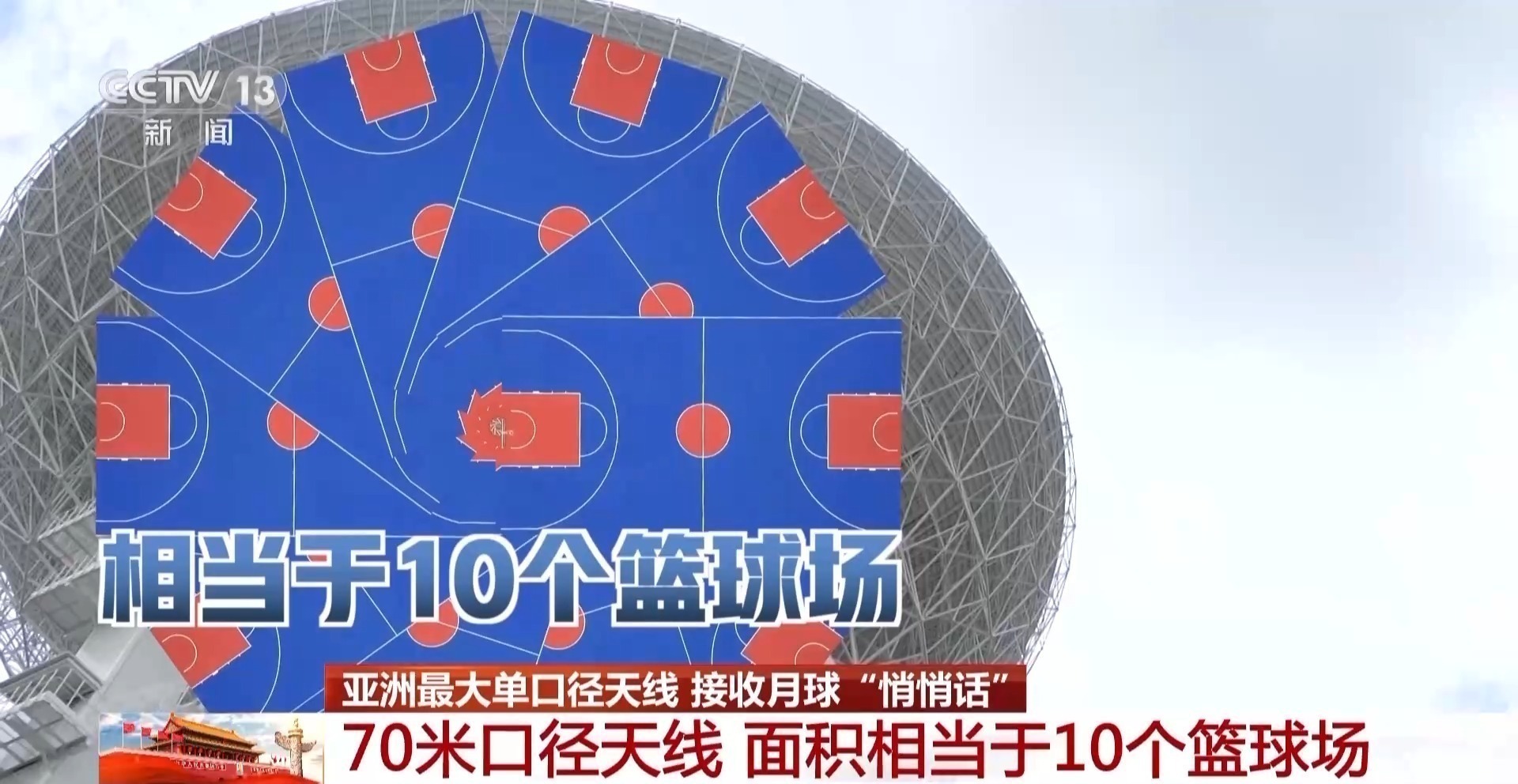 在这个70米口径天线的内部,第一感觉就是非常大。天线所采用的反射面板,它的面积有4560平方米,相当于10个篮球场的大小,天线的高度有72米,重量有2700吨,主要承担探月、探火等深空探测任务的数据接收。