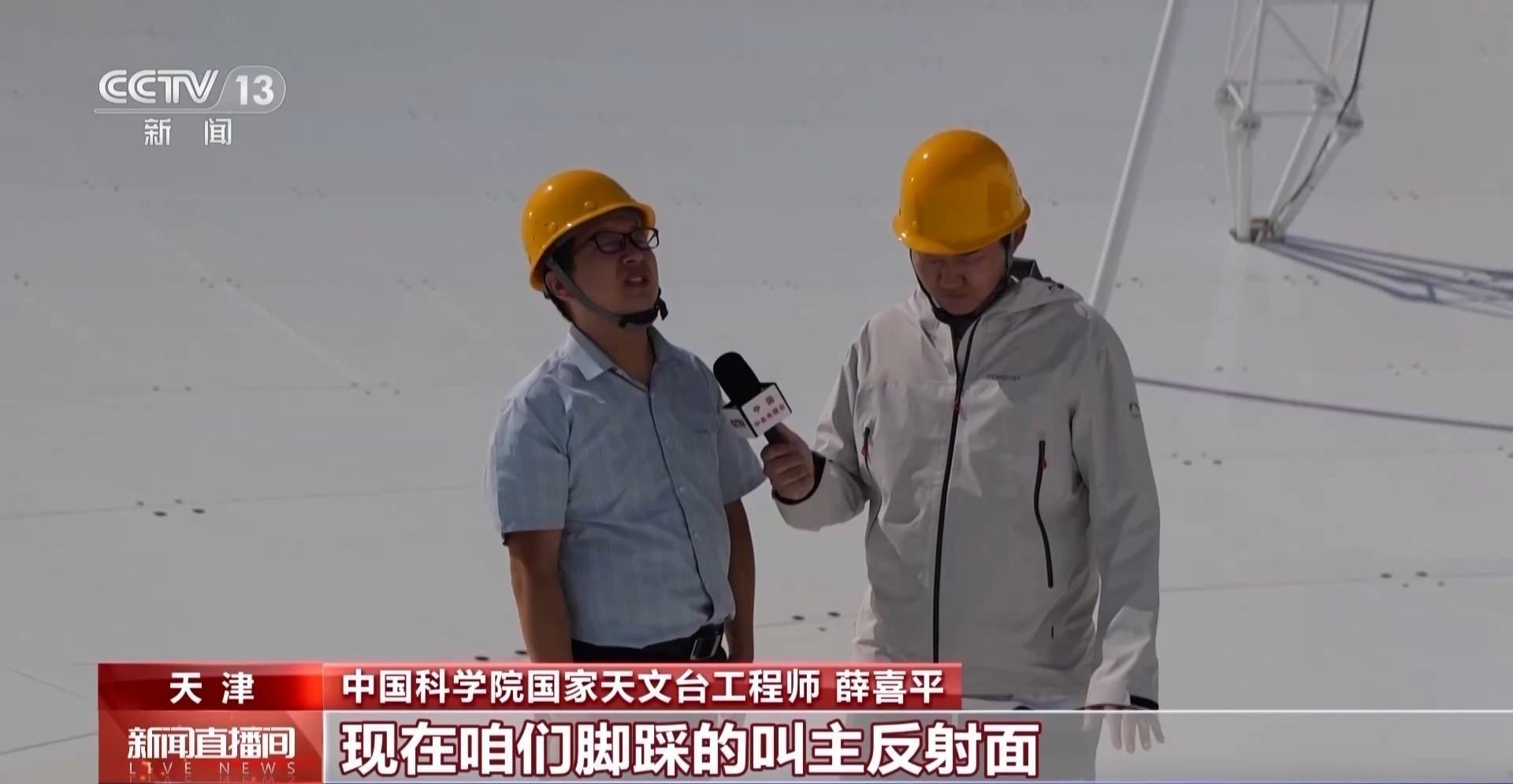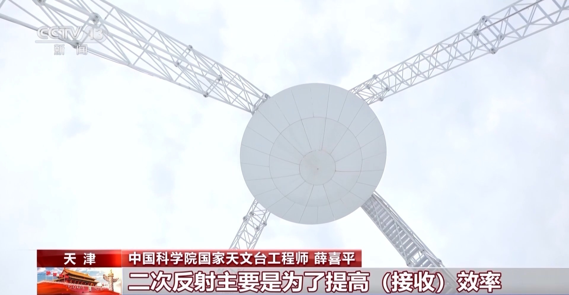 中国科学院国家天文台工程师 薛喜平:咱们天线采用主反射和副反射联合起来工作的一个方式,现在咱们脚踩的叫主反射面,头顶圆盘叫副反射面。卫星下来的信号首先是射到主反射面,再汇聚到副反射面,然后副反面再反射到馈源,就进到我们传输设备里头,是二次反射。