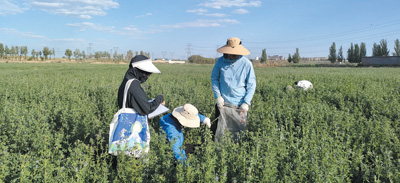 中国农科院草原所鄂尔多斯试验站的科研人员在进行沙地苜蓿生产性状调查。