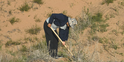 中国农科院草原所鄂尔多斯试验站的科研人员在采集沙地土壤样品、测定土壤容重。