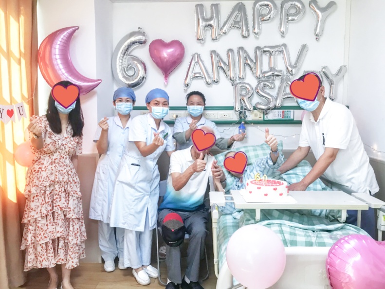 2022年8月,身患淋巴瘤晚期的杨奶奶(化名)入住了中心安宁疗护病区。接收时,杨奶奶的生命评估周期仅有7天,她的家人都无法接受这个现实,沉浸在悲痛的情绪中。中心医护人员在得知杨奶奶的临终心愿是陪老伴度过60周年结婚纪念日时,第一时间着手安排纪念日,帮助杨奶奶整理结婚回忆视频,自费购买鲜花、气球、蛋糕等物料布置临终关怀室。纪念日当天,杨奶奶换上漂亮的衣服,握紧老伴的双手,在镜头前定格幸福的微笑。而杨奶奶的家人也在感人、温馨的氛围中释然。第二天,杨奶奶在老伴和子女的陪伴下安详地走完了人生最后的旅程。