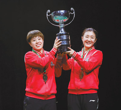 当地时间5月27日,女双冠军陈梦/王艺迪(左)在颁奖仪式上捧起奖杯。