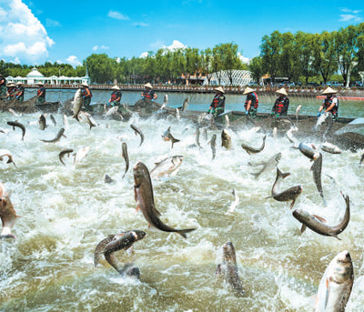 查干湖景区内,渔场职工向游客表演网收鱼跃的场景。 贾宏光摄 |