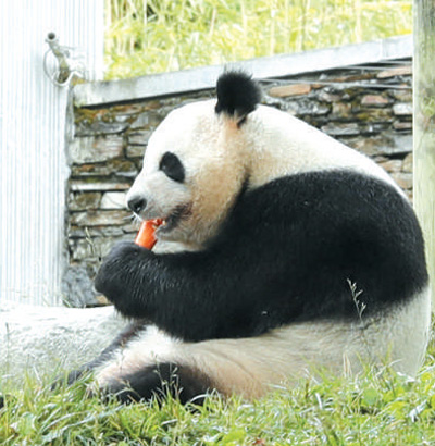 中国卧龙大熊猫繁育中心里的大熊猫在进食。