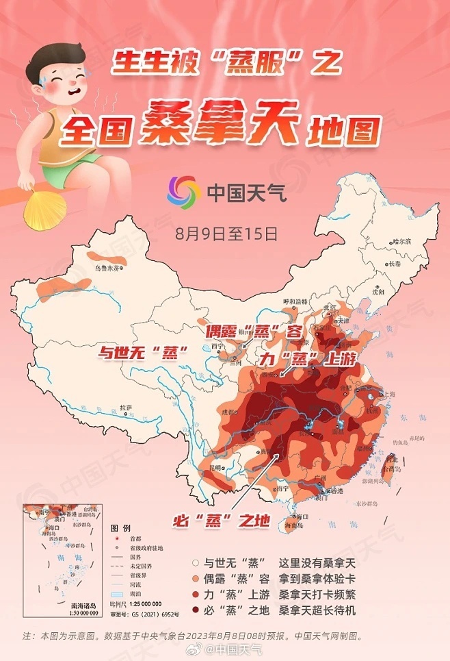 从中国天气网推出的全国桑拿天地图上可以看出,桑拿天最多的是四川、重庆、湖北、湖南、河南、山东等10余个省份的部分地区,特别是湖北和重庆两省市,未来七天大部地区桑拿天会全勤打卡,闷热超长待机,可谓是必“蒸”之地。华南部分地区、江南北部、黄淮大部桑拿天也会经常出没,像是江西中北部、福建东部、安徽中北部、山东中西部、河南中部等地有4至6天都将持续“蒸”,防暑降温也不能松懈。