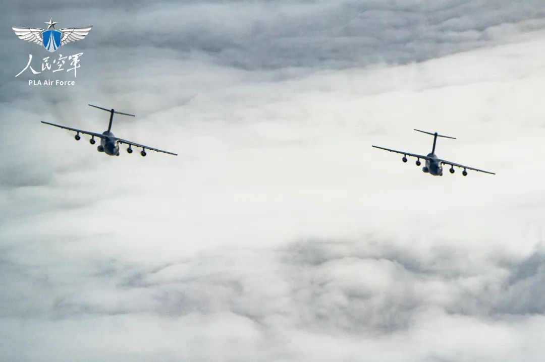 运-20在复杂气象条件下,进行双机编队飞行训练。