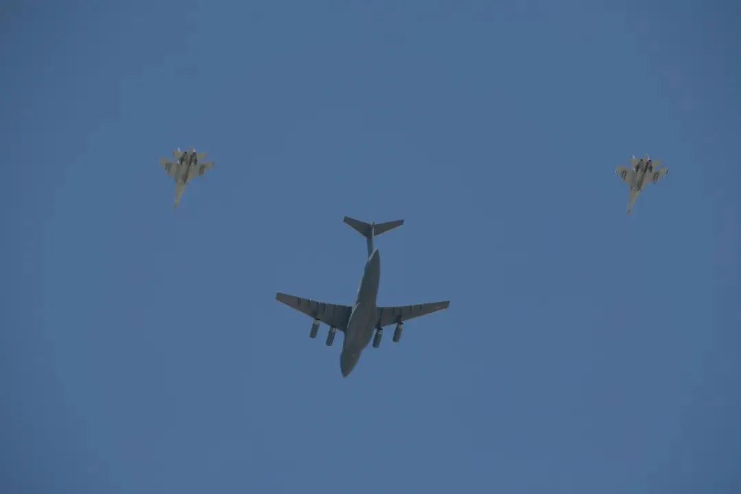 “国际军事比赛-2021”“航空飞镖”项目中,运-20和歼-16进行跨国转场前编队协同演练。