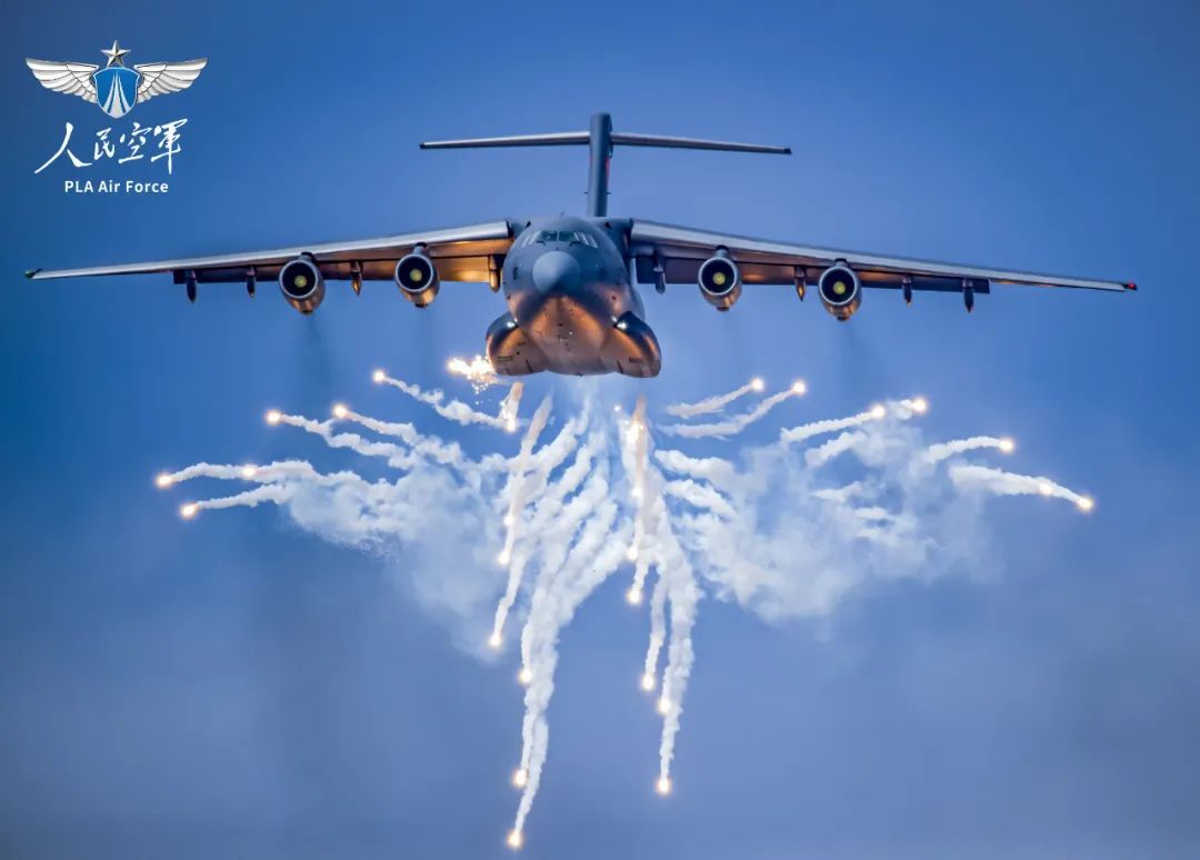 运-20开展释放干扰弹训练。