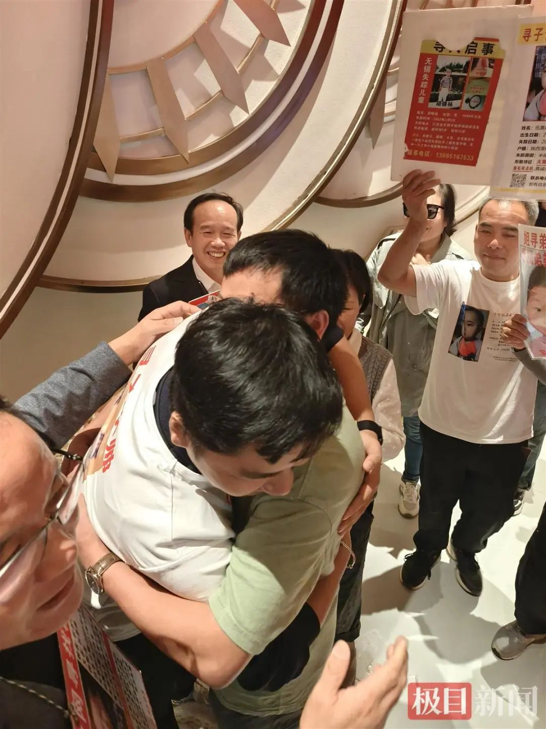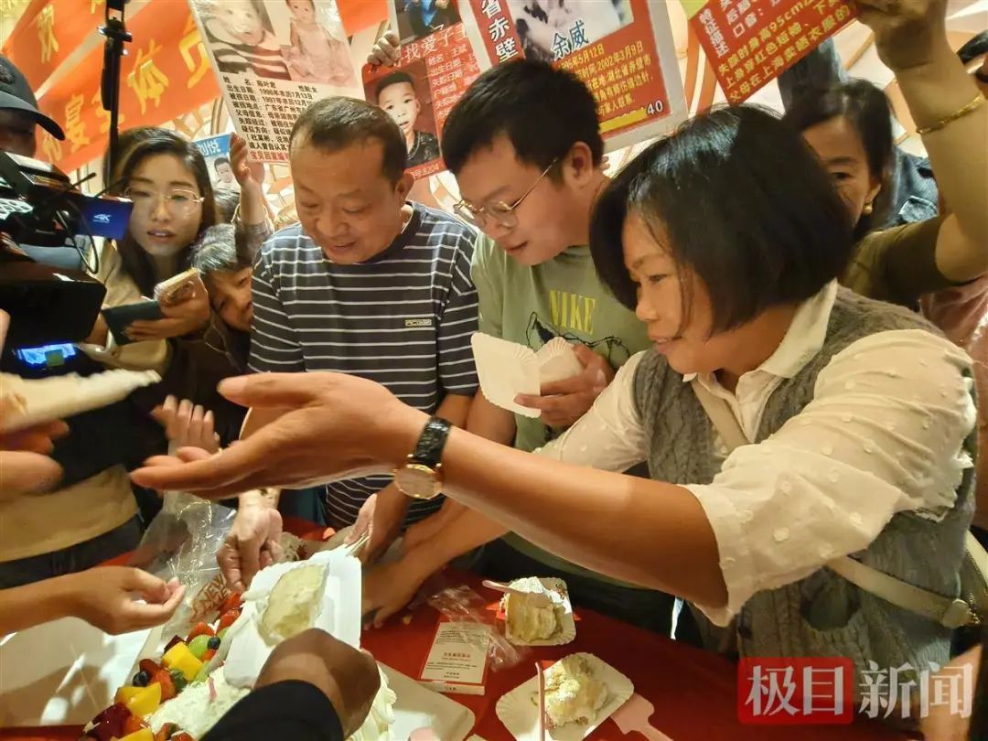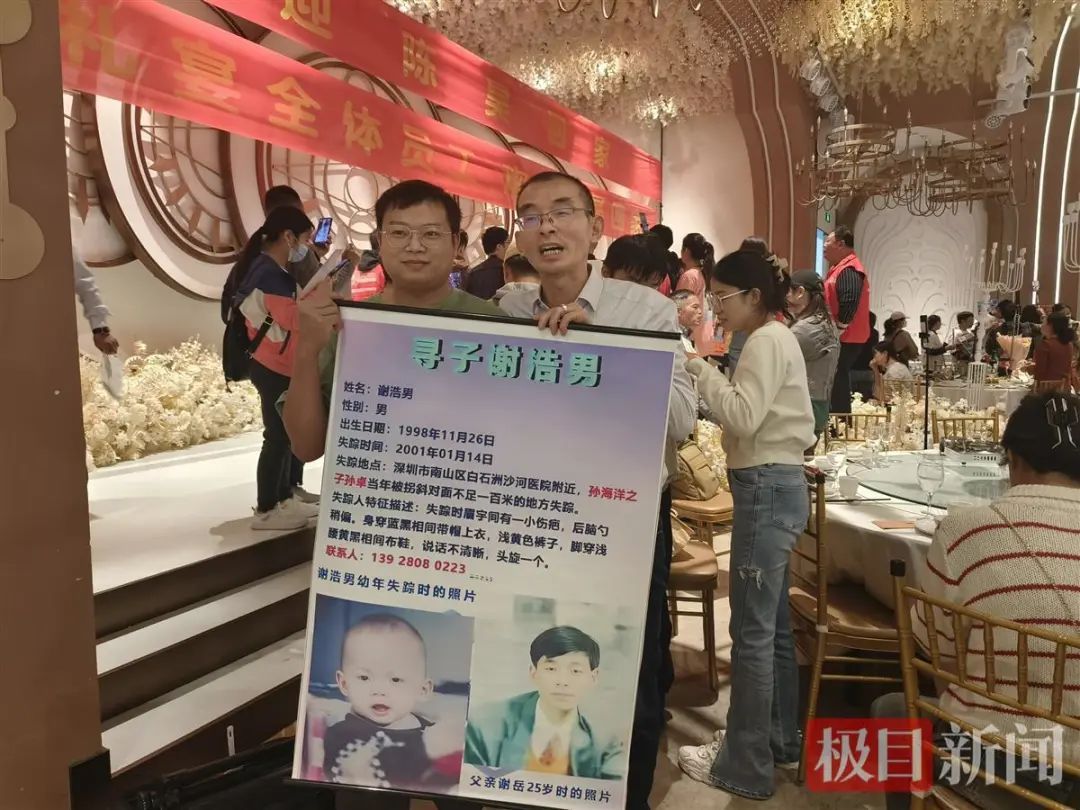 陈昊戴着眼镜,看起来憨厚、老实。父母带着他和弟弟一起敬酒答谢,陈昊有一丝紧张,但脸上总是挂着笑容。偶尔,兄弟俩还会低头交流几句。现场,有许多寻找孩子的父母拉着陈昊合影,他总是耐心地帮忙举着信息牌。陈昊明白,在其他寻亲家庭的眼里,他的回归就意味着希望。