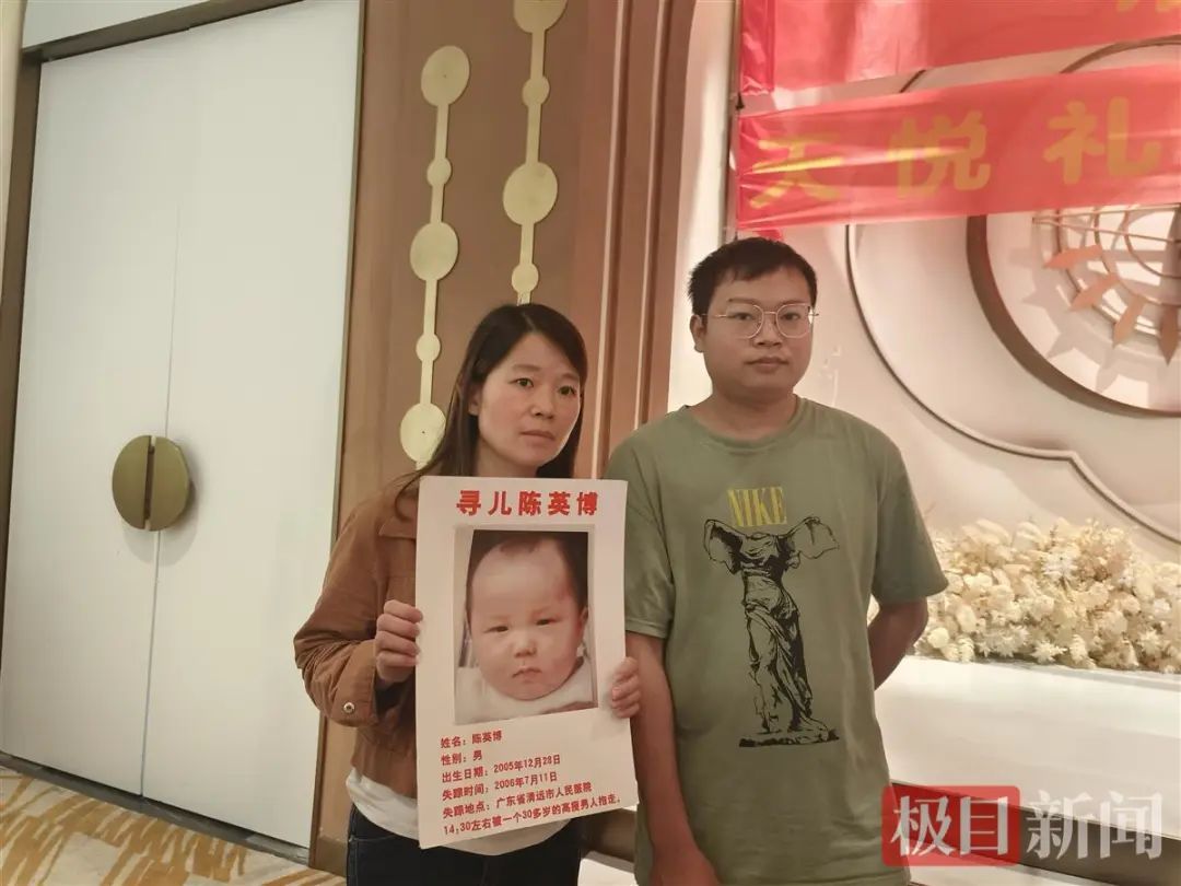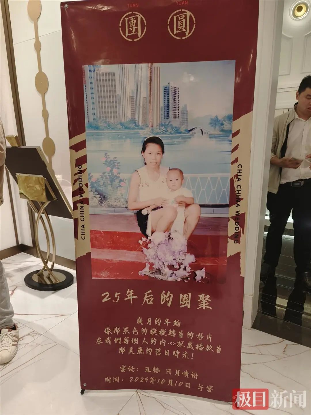 10月10日上午,记者来到位于光谷一路的酒店。在5楼大厅门口,竖立着一张名为“团圆”的海报,上面印着吴学先年轻时与怀中儿子陈昊的合影,下方写着一段文字:“25年后的团聚,岁月的年轮像那旋转着的唱片,在我们每个人的内心深处播放着……”