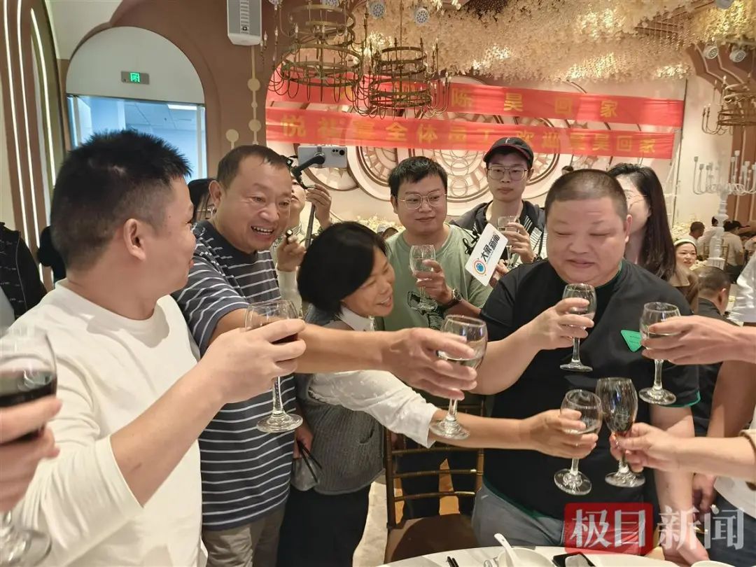 吴学先和丈夫也难掩心中的喜悦,他们逐桌敬酒。丈夫说道:“这比我中了五百万还高兴!”吴学先说,儿子回来了,她身体上的毛病都不算什么了,儿子回家就是最好的良药。