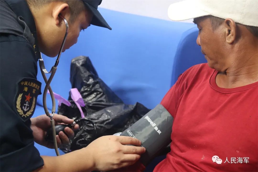 ▲中国海军阿坝舰军医为菲律宾受伤渔民测量血压 潘跃强 摄