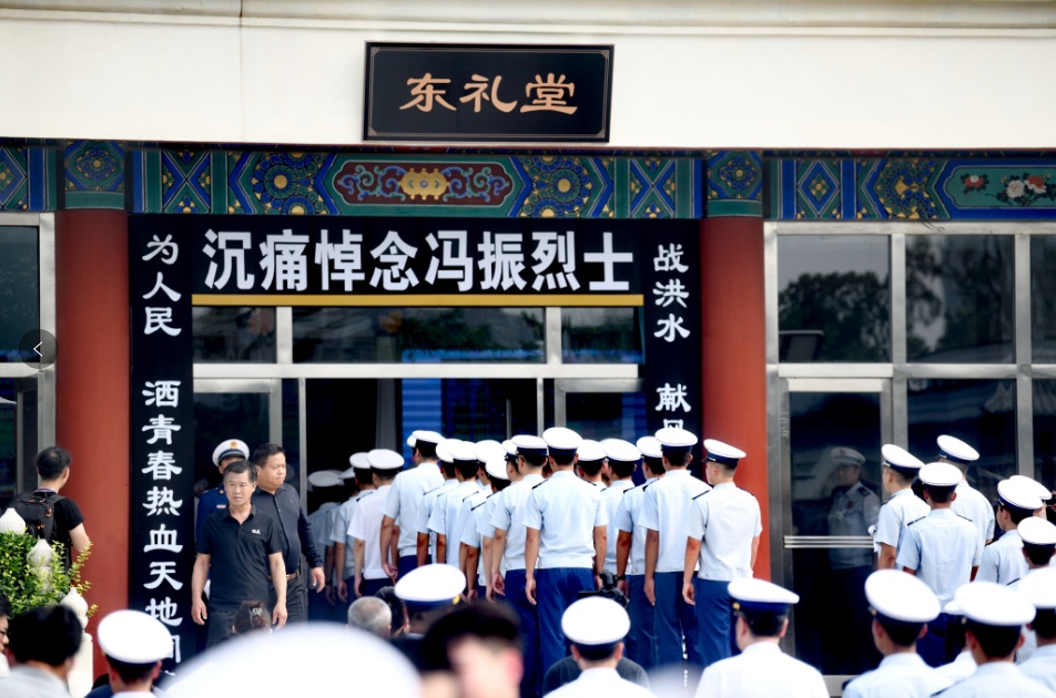 哀乐低回,挽联低垂,青松欲泪,山河同悲。8月4日上午,在强降雨抢险救灾中壮烈牺牲的冯振烈士遗体告别仪式在北京八宝山殡仪馆举行。