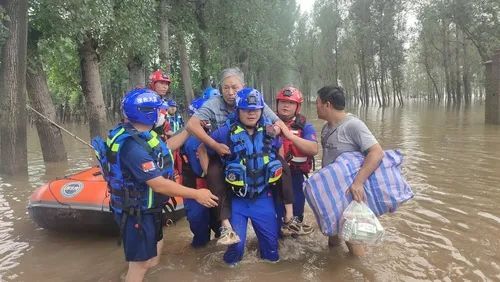 河北省涿州市码头镇沙窝村,贵州蓝天救援队队员在转移受困村民。新华社发