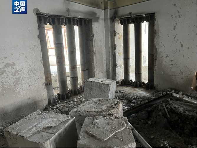 据报道,涉事居民楼底商共3层,被破坏了的承重墙位于第3层,底商之上还有19层住宅,共3个单元287户。现场的相邻两面墙被整齐切割出两个大洞,被切割的墙体有60多厘米厚,钢筋混凝土石块堆在地上,施工现场2层还有四处未实施的拆墙标记,其中一处写着“开窗户,越大越好”。