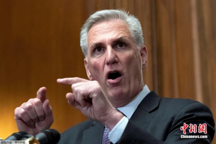 当地时间2023年5月31日,美国众议院议长麦卡锡在华盛顿国会大厦召开的记者发布会上,针对国会通过债务上限法案发言。