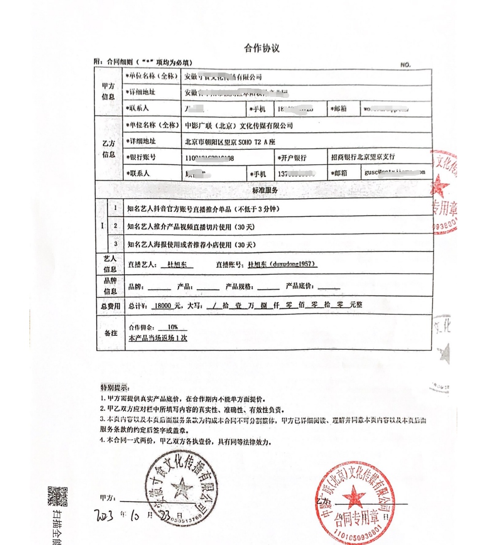 直播“翻车”后,万经理要求中影广联进行补偿,其承诺将免费补播一次。但到了11月,杜旭东又因曾为电诈头目录制庆生视频引发争议,负面新闻缠身。寸食公司拒绝再与其合作,万经理要求退款后,一度被中影广联相关负责人拉黑。